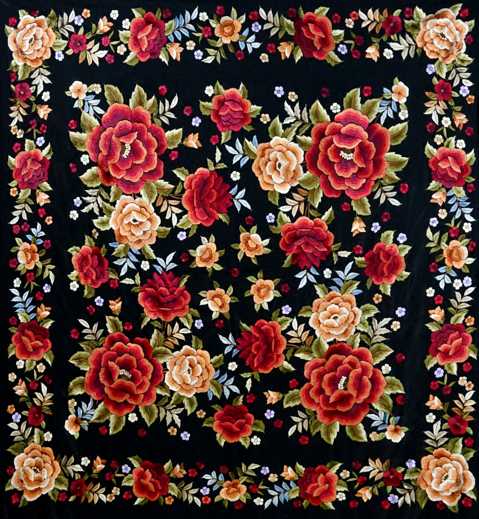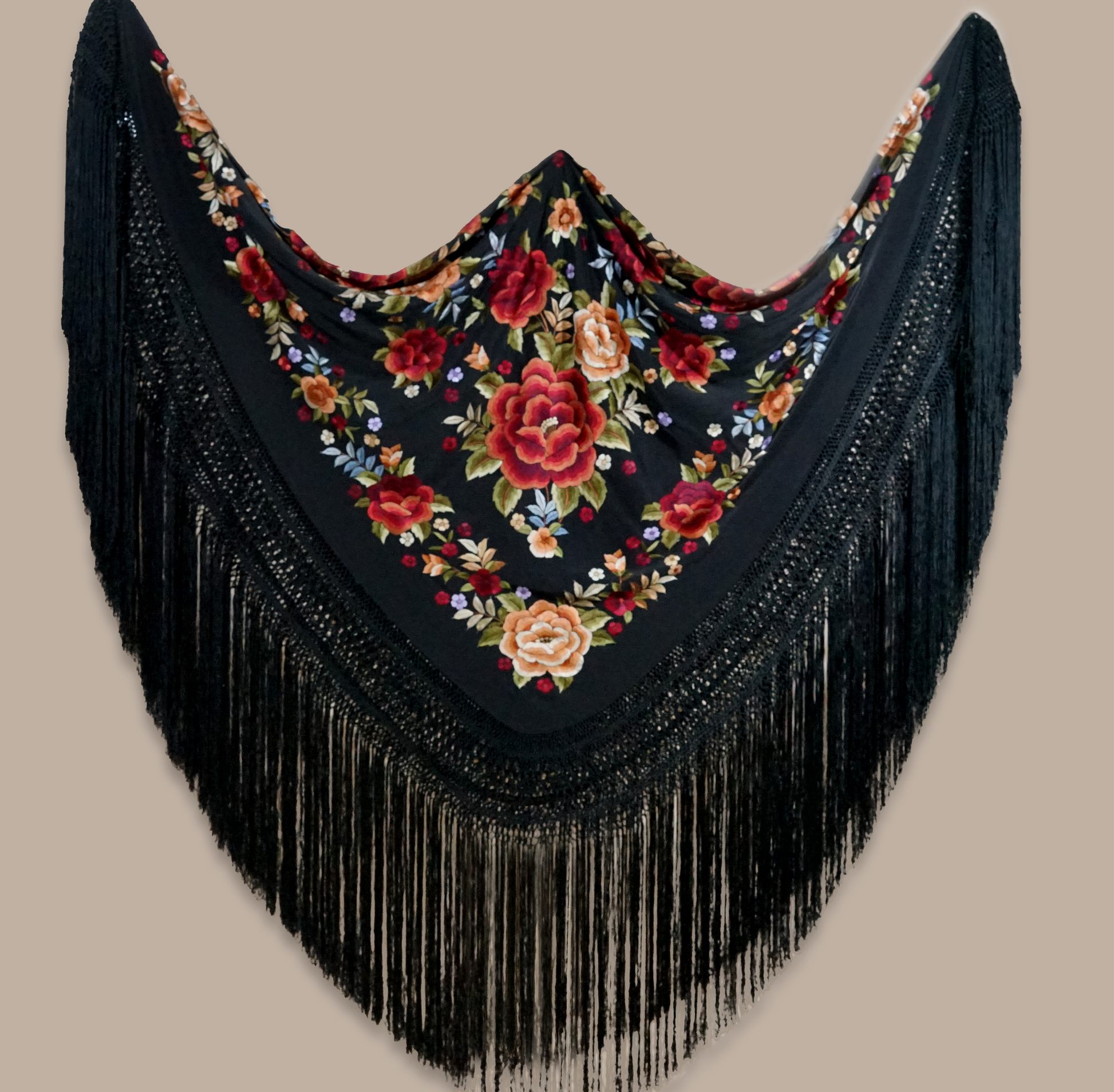 Mantón de seda natural bordado a mano. Pieza artesanal de 135 × 135 cm con fondo negro y bordado multicolor. Perfecto para looks de impacto y eventos especiales.