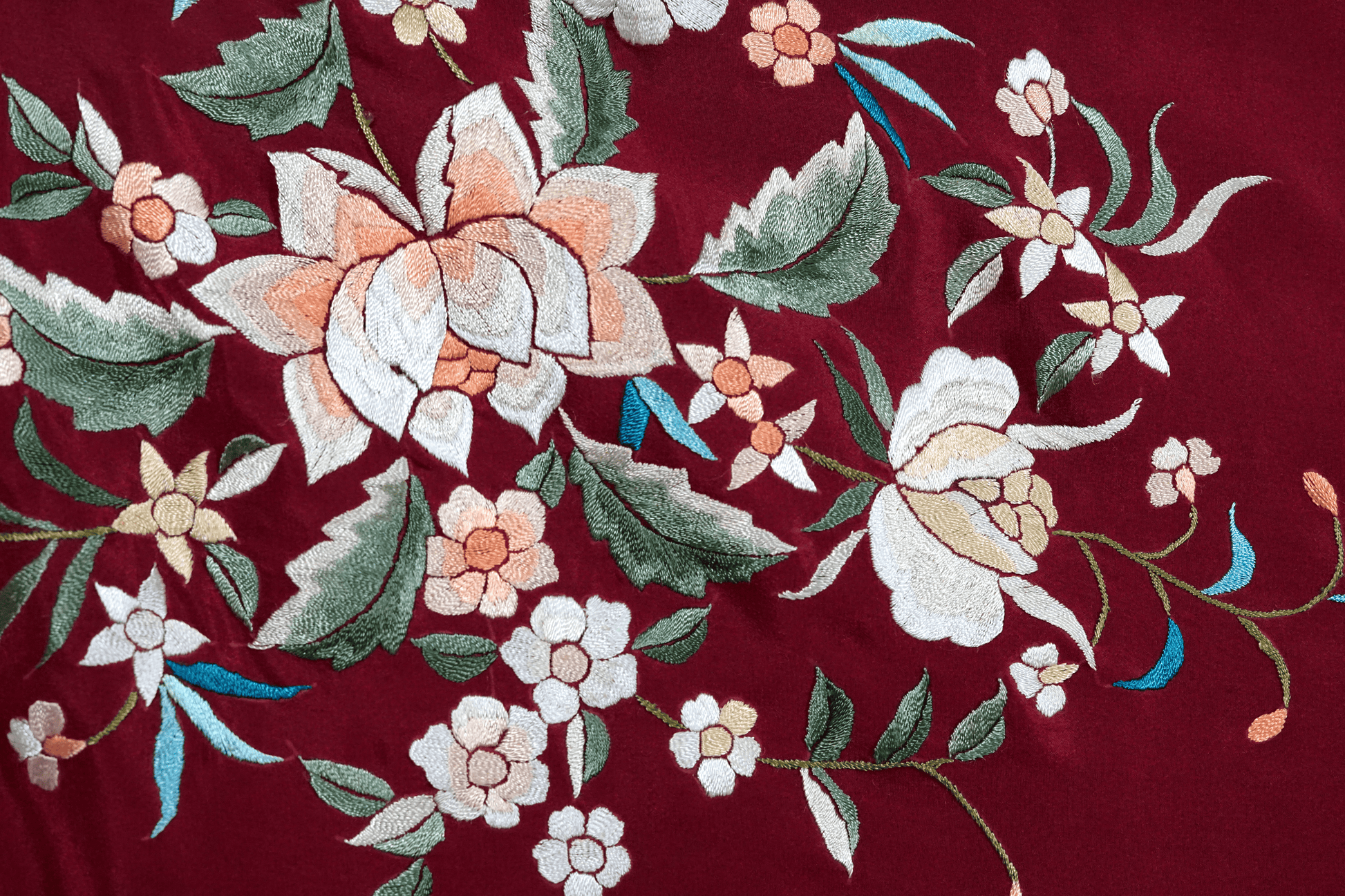 Mantón de seda natural bordado a mano. Diseño artesanal de 135 × 135 cm en seda burdeos con bordado multicolor. Intenso y elegante.
