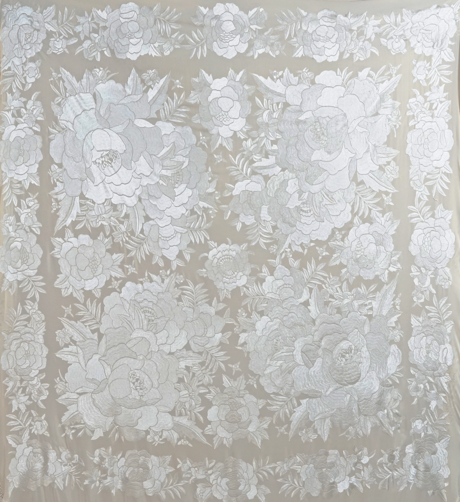 Mantón de seda natural bordado a mano. Pieza suave y armónica en tonos crema, 135 × 135 cm. Ideal para celebraciones o conjuntos luminosos.