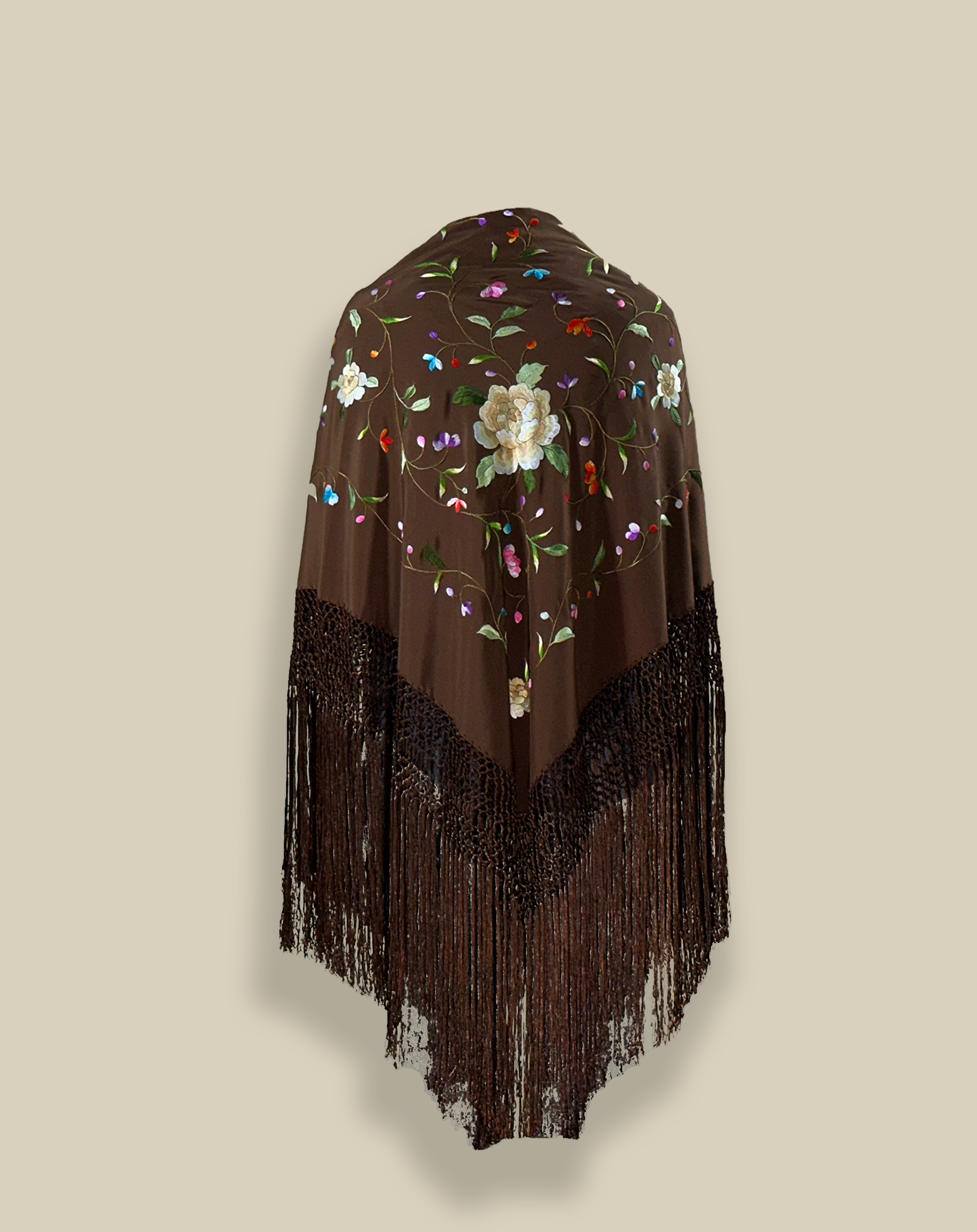 Mantón de seda natural bordado a mano. Diseño artesanal de 110 × 110 cm. Fondo marrón chocolate con bordado multicolor. Tonalidades cálidas para un estilo distinguido.