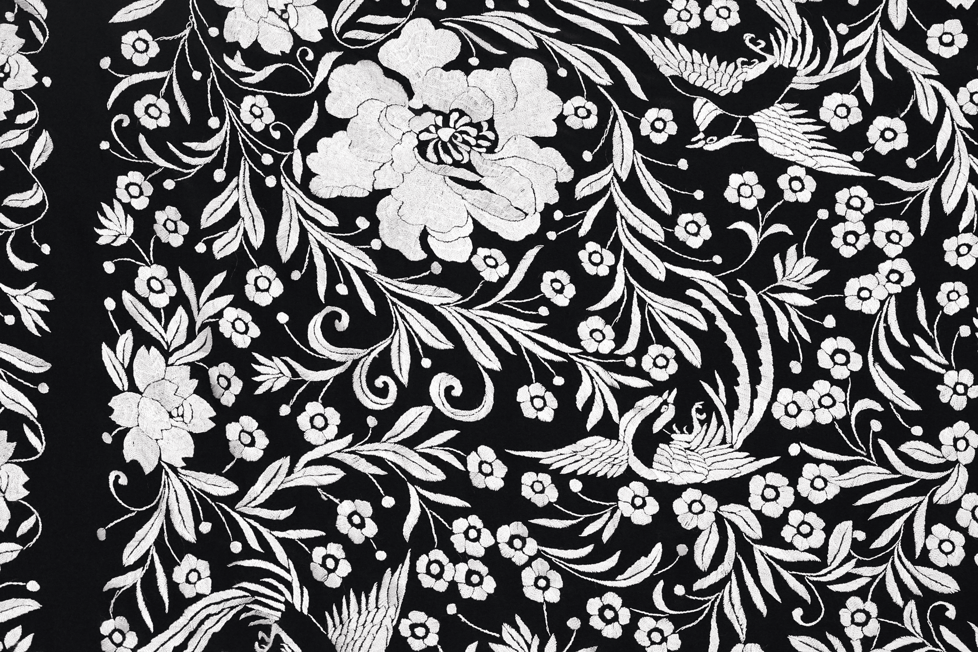 Mantón de seda natural bordado a mano. Contraste elegante: seda negra con bordado blanco. Formato 135 × 135 cm.