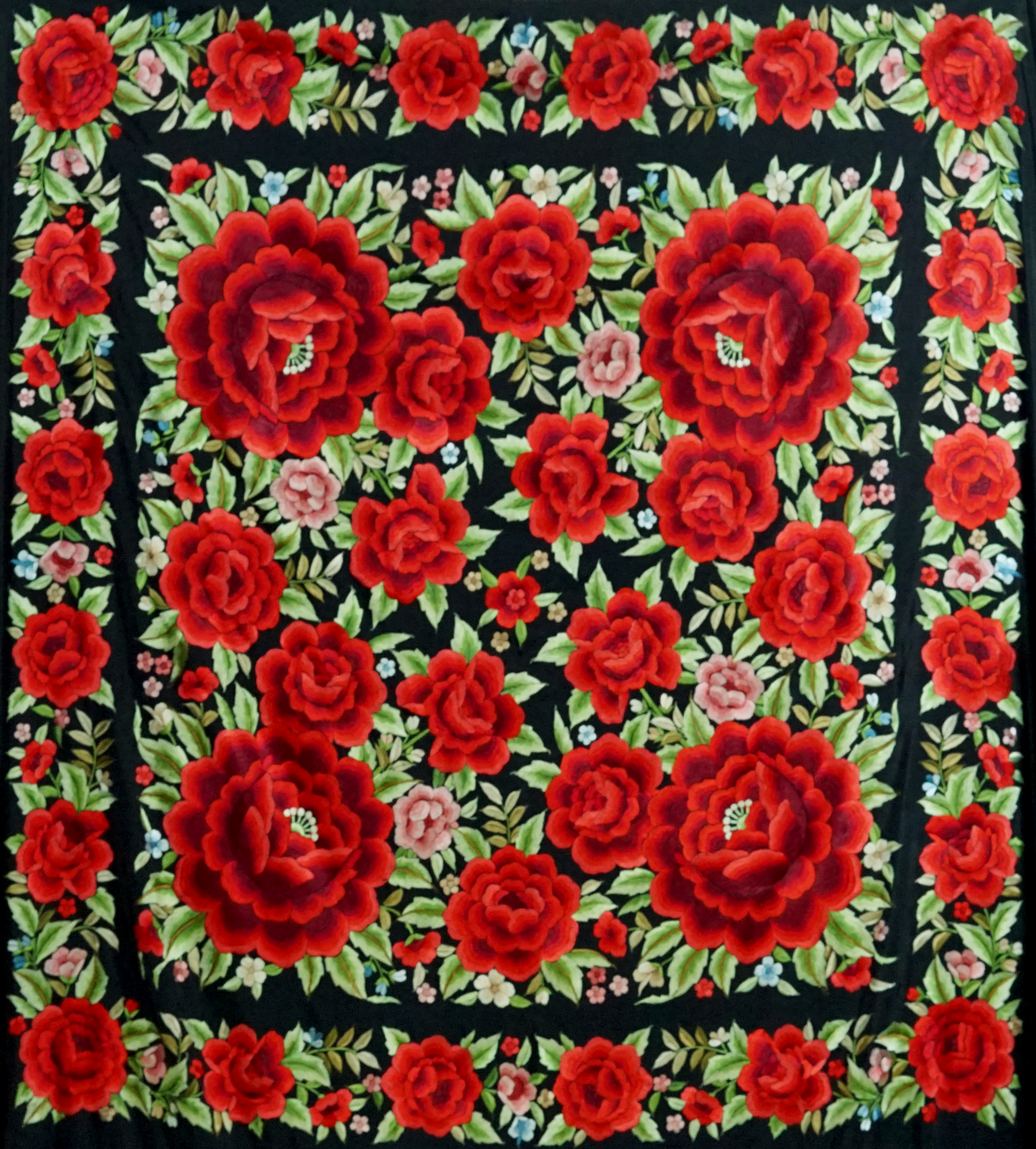 Mantón de seda natural bordado a mano. Pieza artesanal de 135 × 135 cm en fondo negro con bordado multicolor. Un diseño lleno de vida para vestir con fuerza y elegancia.