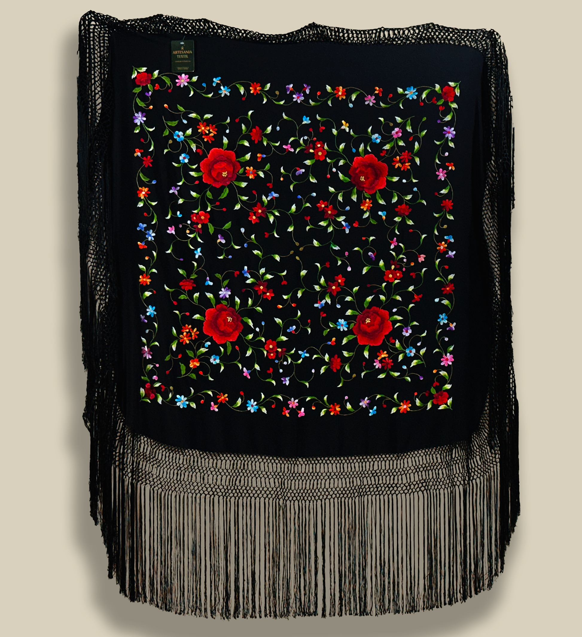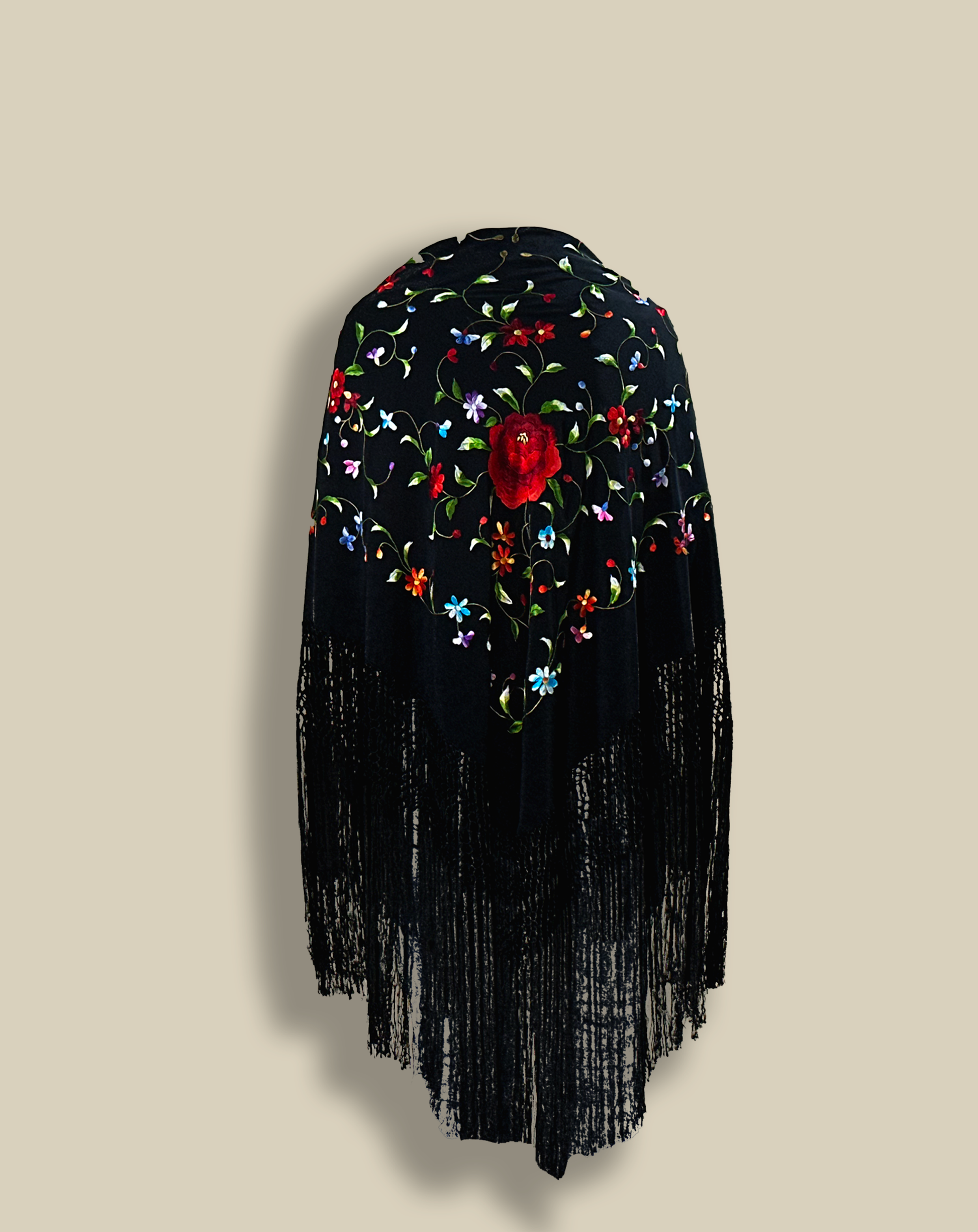 Mantón de seda natural bordado a mano. Pieza exclusiva de 110 × 110 cm. Fondo negro con bordado multicolor. Tradición y fuerza en una misma prenda.